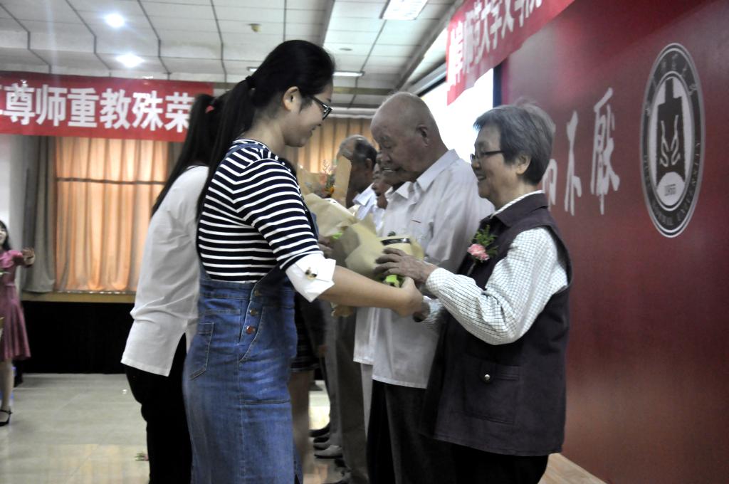 苏占兵首先对学校领导及到场老师做了介绍,表达了教师节对各位教师的感谢及节日的祝福。学生代表杨常乐、李安奇深情朗诵《师说》,并向离退休老教师敬献鲜花,行鞠躬礼,表达对老师的感恩之情。