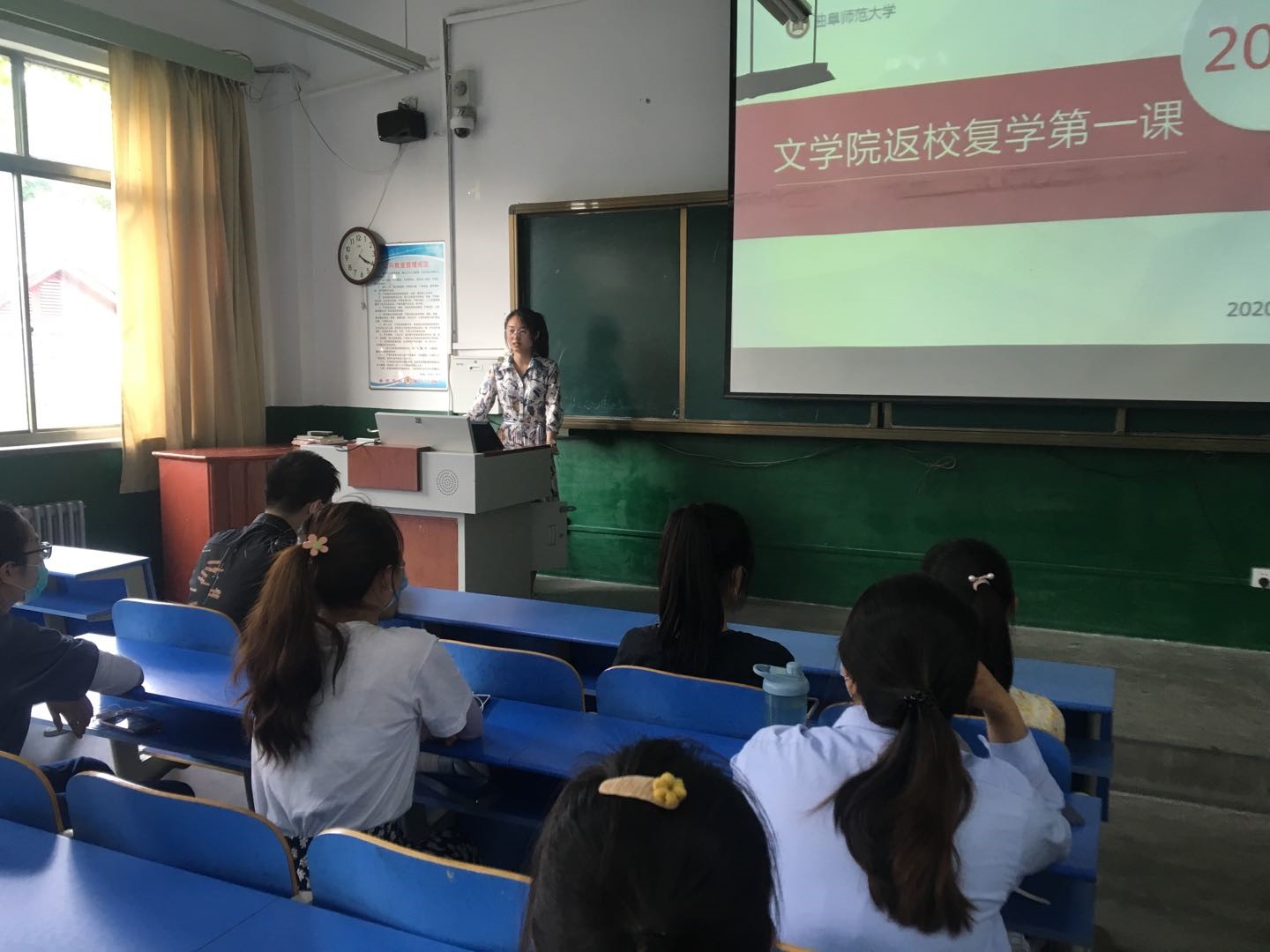为加强学生返校后的疫情防控工作,开展疫情防控知识教育,提升防控意识、增强防控能力,5月29日下午4时,老虎机赌场 2020年春季学期“返校复学第一课”在老虎机赌场 324教室举行,老虎机赌场 党委副书记曲媛媛、17级辅导员李宝麒以及全体返校本科生共同参加活动。