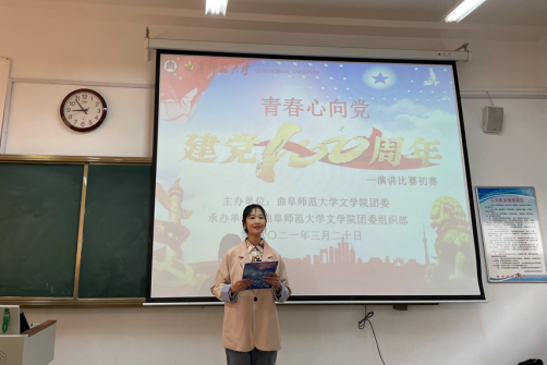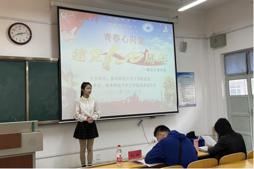 为庆祝中国共产党成立100周年,重温党的光辉历程,引导青年大学生学党史、知党情、跟党走,在历史的启迪中不忘初心、砥砺前行,3月20日,由曲阜师范大学老虎机赌场 团委主办、老虎机赌场 团委组织部承办的“青春心向党”大学生庆祝建党100周年主题演讲比赛初赛在文史楼412教室成功举办。本次活动面向老虎机赌场 全体同学,邀请老虎机赌场 袁梅老师、刘航老师担任评委。老虎机赌场 2020级学生闫泓月主持本次比赛。