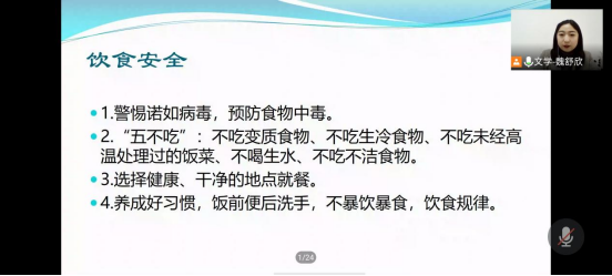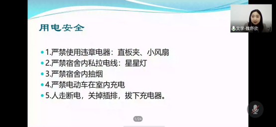 本次会议主要围绕学生交通安全、用电安全、财产安全、饮食安全、疫情防控、五一假期放假安排及注意事项六个方面具体展开。会议中,魏舒欣老师首先从不同出行方式具体谈需要注意安全的地方,并以图片的方式向同学们介绍了货车致命的盲区。其次,魏老师强调在宿舍严禁使用违规电器,严禁私拉电线,严禁抽烟,严禁电动车室内充电,做到人走断电。在财产安全方面,魏老师提醒大家要保管好贵重物品,警惕网络诈骗,保管好各类证件,拒绝各种“贷”,理性消费。接着,魏老师提到天气越来越热了,要格外注意饮食安全,选择健康、干净的地点就餐。然后,魏老师再次强调疫情防控不可懈怠,五一假期出行要配戴口罩,坚持每日健康打卡,应尽量减少出行,如若出行,务必做好出行报备工作。最后,魏老师详谈了五一假期放假安排以及注意事项,并提前预祝大家假期愉快。至此,本次会议圆满结束。