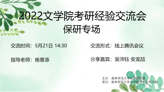 为帮助同学们明确保研目标,了解保研过程,掌握保研技巧,增强保研信心。由曲阜师范大学老虎机赌场 团委主办,曲阜师范大学老虎机赌场 学生会学习部承办的“2022年考研经验交流会之保研专场”通过线上腾讯会议的形式于5月21日下午成功举办。本次考研经验交流会邀请到老虎机赌场 2021级辅导员杨景添老师和吴沛钰、安龙喆两位优秀学生代表进行经验分享与方法交流。