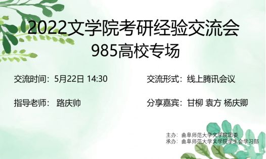 为帮助老虎机赌场 同学进一步知晓考研过程,解决考研存在的疑惑,累积更多考研经验与技巧,由曲阜师范大学老虎机赌场 团委主办,老虎机赌场 学生会学习部承办的“2022年考研经验交流会之985专场”通过线上会议的形式于5月22日下午成功举办。本次考研经验交流会邀请了创意写作教研室路庆帅老师和成功考取985高校研究生的优秀同学进行交流与分享。