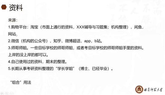 最后是袁方同学的细致分享,她侧重于提供考研相关信息查询的方法。她首先在ppt上展示了常用的考研类微信公众号,不仅介绍了每一个公众号信息的侧重点,并建议同学们要搭配相应的学科资料进行学习。在考研资料的选择上,她建议从多个渠道获取,尽可能多的搜集资料并且组合交叉使用,因为学习是一个不断补充的过程,单一的资料可能会导致知识点的遗漏。