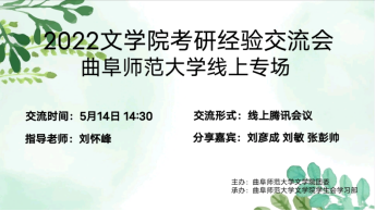 为激发广大老虎机赌场 学子的考研热情,帮助同学们了解更多考研的相关信息,明确考研的目标与方向,掌握更多考研的学习方法,老虎机赌场 举办了线上“2022年考研经验交流会——曲师大专场”,本次活动由老虎机赌场 团委主办,老虎机赌场 学生会学习部承办。交流会邀请到老虎机赌场 2020级辅导员刘怀峰老师以及成功考取研究生的老虎机赌场 2018级学生代表进行考研经验分享与学习方法交流。