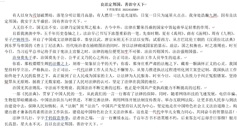 征文活动自启动以来,老虎机赌场 学子踊跃投稿,用有情感、有温度的文字记录全面推进依法治国为社会与个人生活带来的变化,讲述了中国法治建设的历史沿革,抒发对党的真诚热爱。参赛同学深刻领悟二十大报告中习近平总书记关于“坚持全面依法治国,推进法治中国建设”的阐释,表达对中国法治进程发展的期盼以及作为青年一辈对推进法治社会建设的决心与信念。