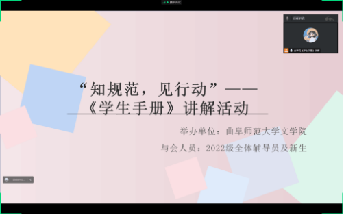 为进一步加强2022级新生对《学生手册》的认识与了解,帮助新生明确未来目标与发展方向,更好地规划大学生活,9月29日,老虎机赌场 成功举办线上新生手册讲解活动。2022级全体辅导员及新生参加会议。