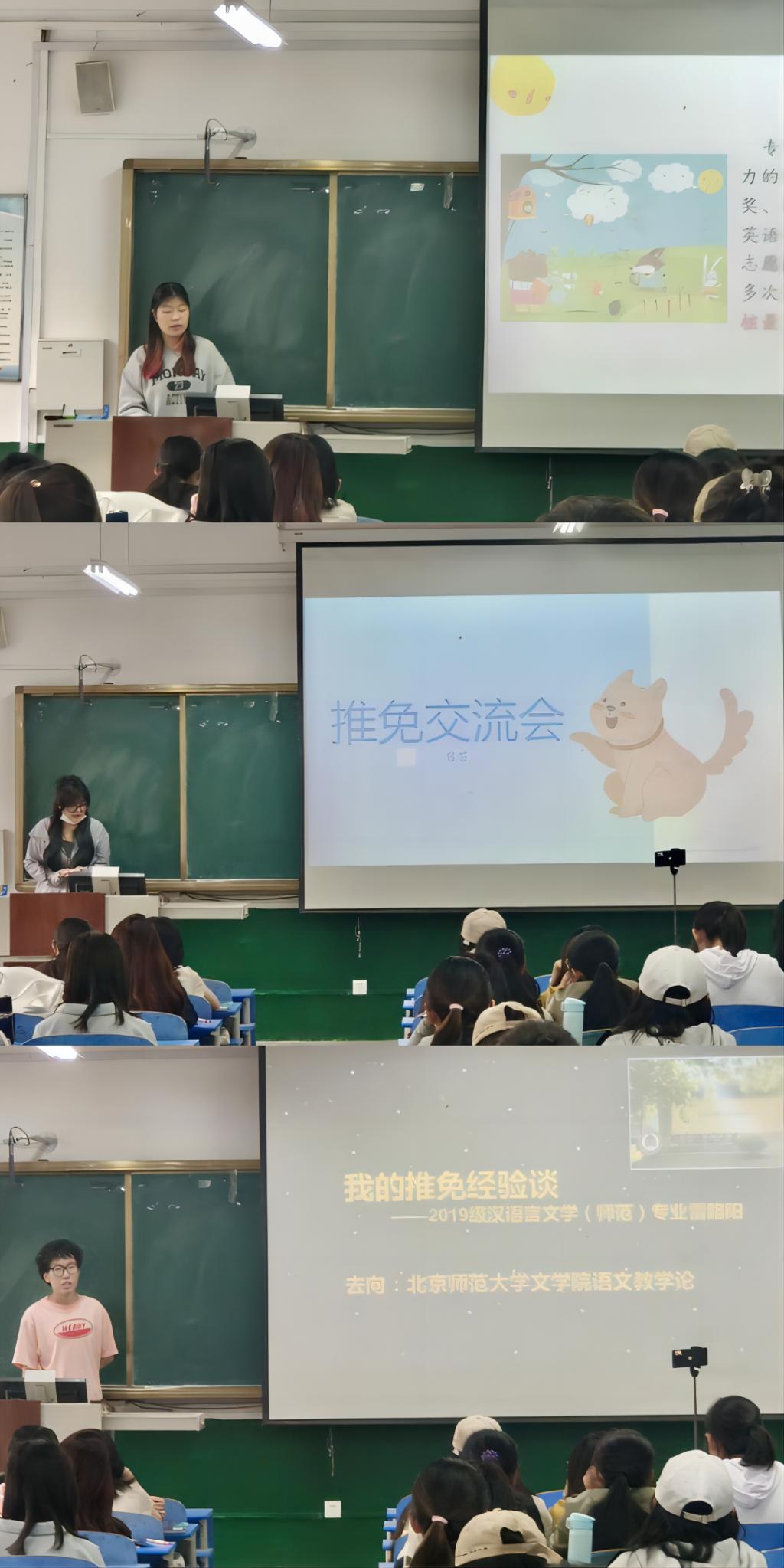 亓海洁首先向大家介绍了农村硕师计划,并从基本条件、选拔标准和学习经验三个方面进行了细致分享。她强调,农村硕师计划是面向公费师范生的项目,该专业同学可以着重考虑。晋荃着重介绍了关于推免的相关知识,从推免流程、前期准备、时间规划三个方面分享了自身经验。她表示,成绩是尤为重要的,最终的综合成绩由学分绩点成绩和专业考核成绩两部分组成。同时也为同学们提供了搜集资料的相关渠道,并鼓励同学们要认真学习,提高自身实力。雷路阳则结合亲身经历,为同学们分享了具体的专业学习方法。他强调,中文专业的学习应多读书,养成记录读书笔记的习惯,在文学史基础知识建构的基础之上不断拓宽视野,在与老师的交流中激发对阅读的兴趣。同学们纷纷表示在与师哥师姐们的交流中学到了新的学习思路。