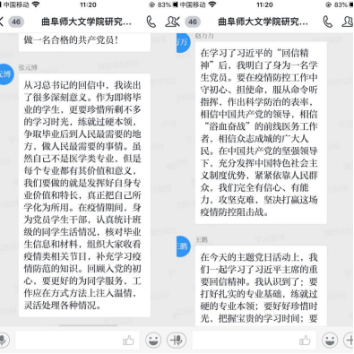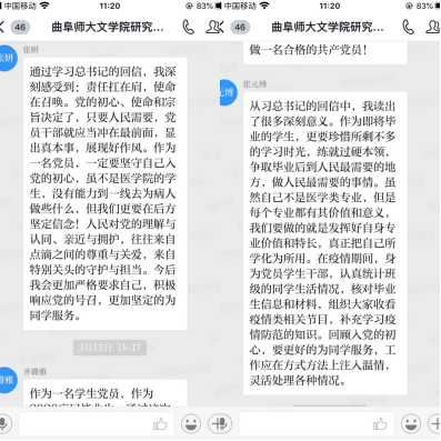 研究生党员齐璐雅表示,作为即将走出校园的青年党员,要学好本领,真正到人民最需要的地方去,扎根基层,建设家乡,才能不忘初心、不负时代。本科生党员张艺伟说:“通过学习,我懂得了练就扎实基本功对报效国家服务人民的重要意义。面对即将到来的师范生实习支教生活,我要牢记青年的责任,珍惜学习时光,在教学实践中练就过硬本领。”交流中,本科生党员自发书写“武汉加油”字样,表达了青年学子对打赢疫情防控阻击战的必胜信心。